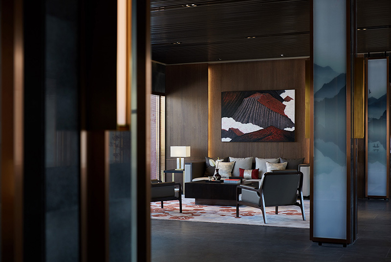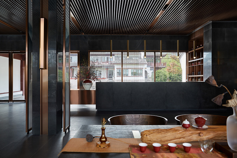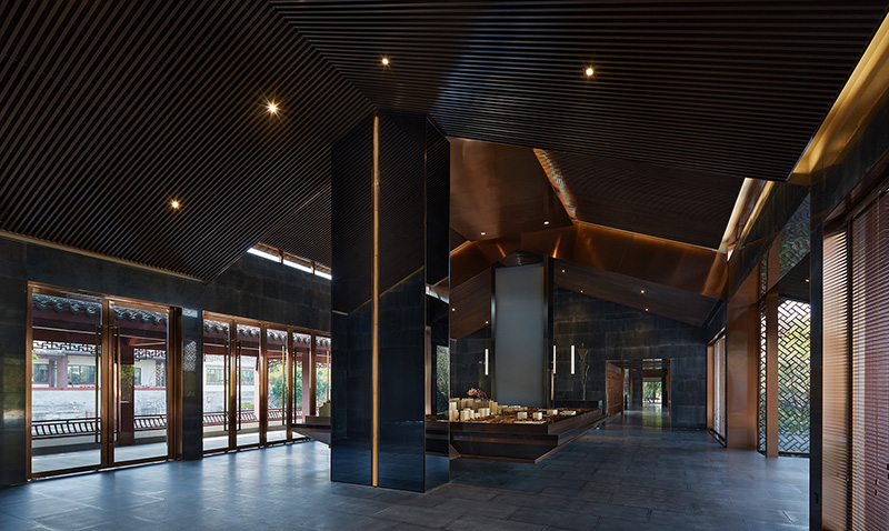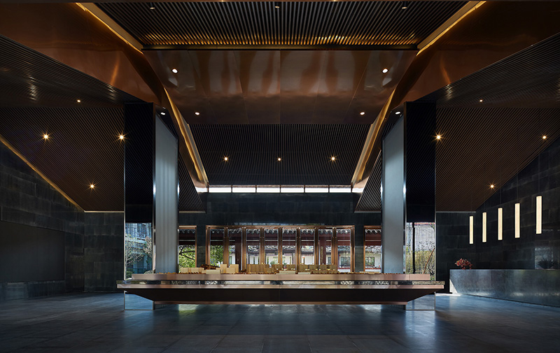 大堂内注重材质的克制与平衡,大面的黑色基底将仪式感与雄浑气势渲染而出。金属镂空格栅显江南韵律,斜屋顶及顶端挑空区窗口,则是对传统物态的解构与再造。剥开视觉表象,映射出来的是现代、东方、艺术、自然等内核元素,给宾客无与伦比的感官体验。