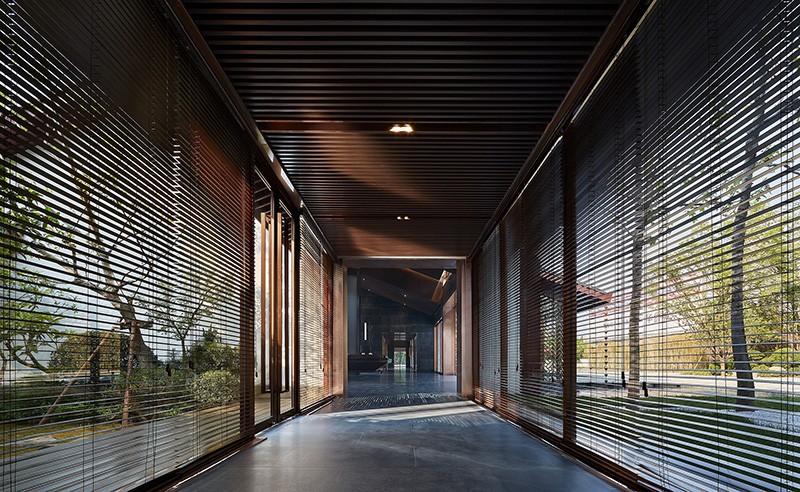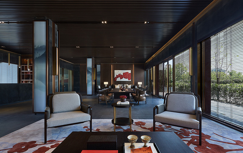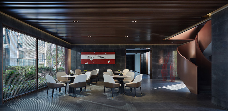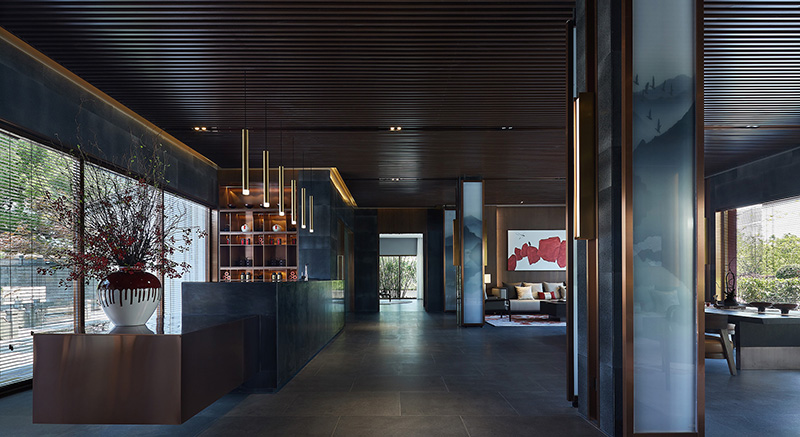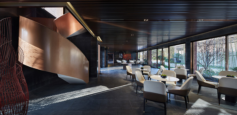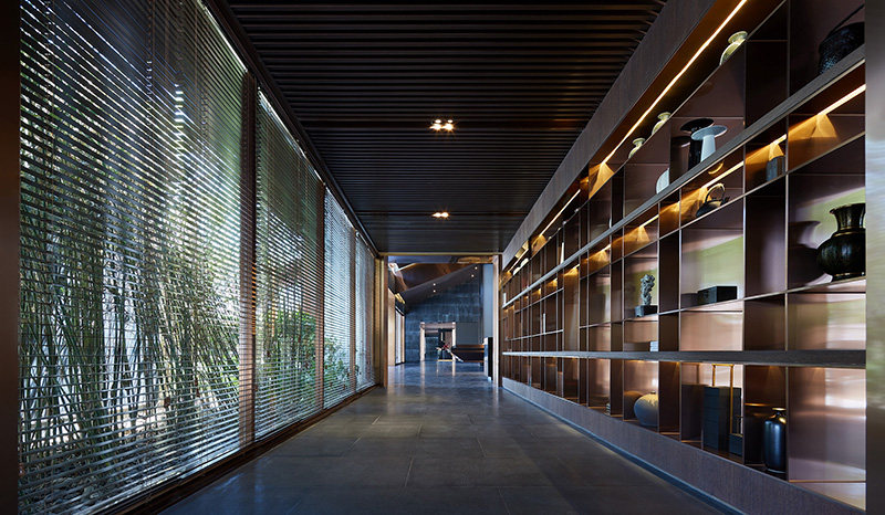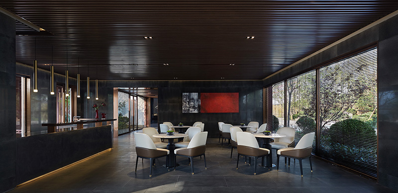 大堂西侧,全景落地玻璃及百叶搭配,加以园林框景手法,呈现意境之美、隐隐约约之效。穿回廊而过,便见洽谈区,顿时豁然开朗。