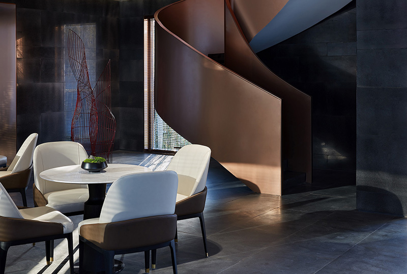 古铜包裹楼梯螺旋而上,功用与审美效果兼具。一隅而立的“蝶影”雕塑以曲线自然伸展,仿若蝶儿展翅欲语芬芳。二者既有体态上的匹配,又为空间增添了几丝柔和与轻盈。