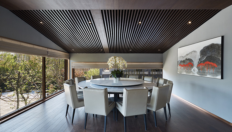 二楼设有两间独立包厢,供宾客携友享用。保留古建筑原有倾斜屋顶,尊重格局而做设计,大道至简,方圆之间,各得其妙。借由通透的落地窗引入美好景致,让视线变得有趣,用餐更为舒适、自然。
