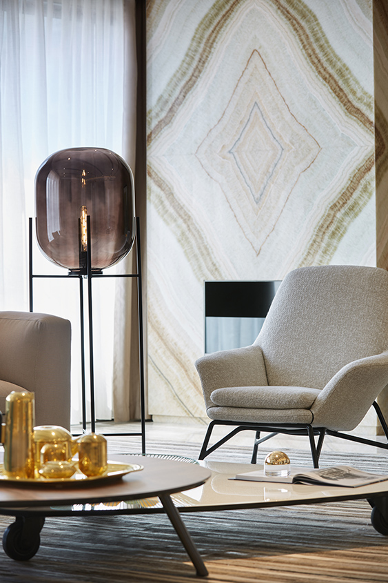 主要材料 | 古堡灰大理石、鱼肚白大理石、木皮染色饰面、拉丝不锈钢镀黑钛、皮革