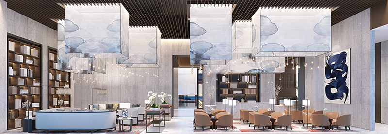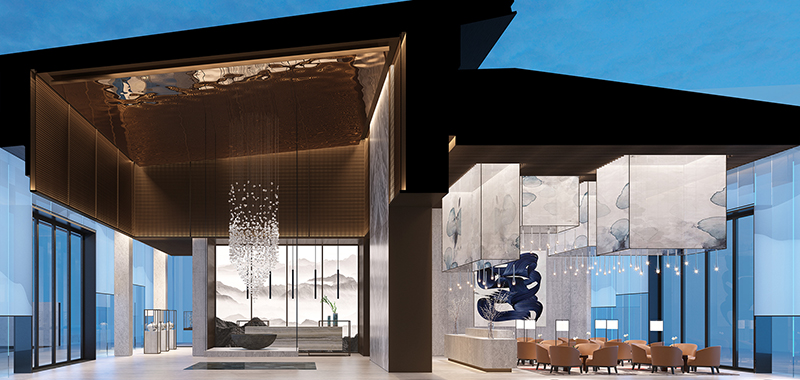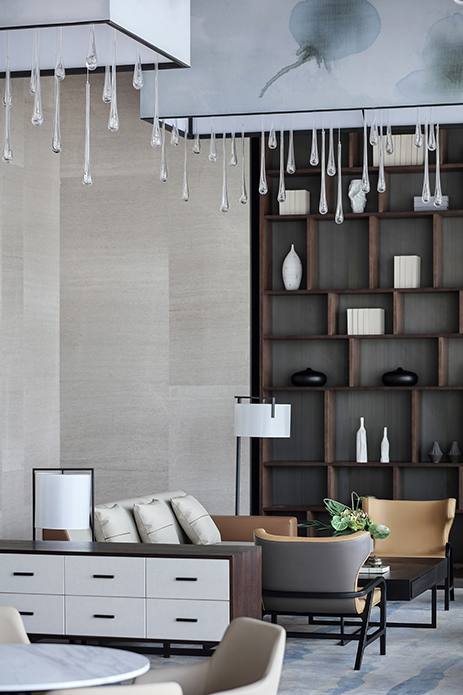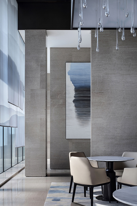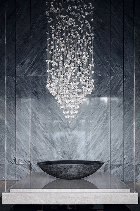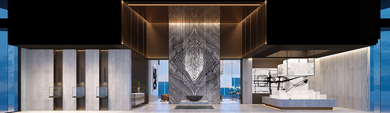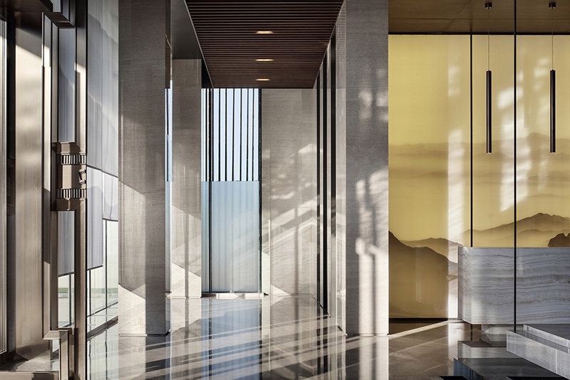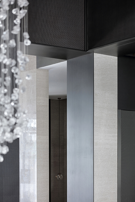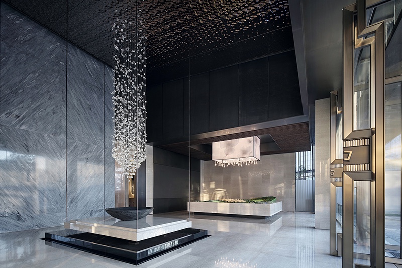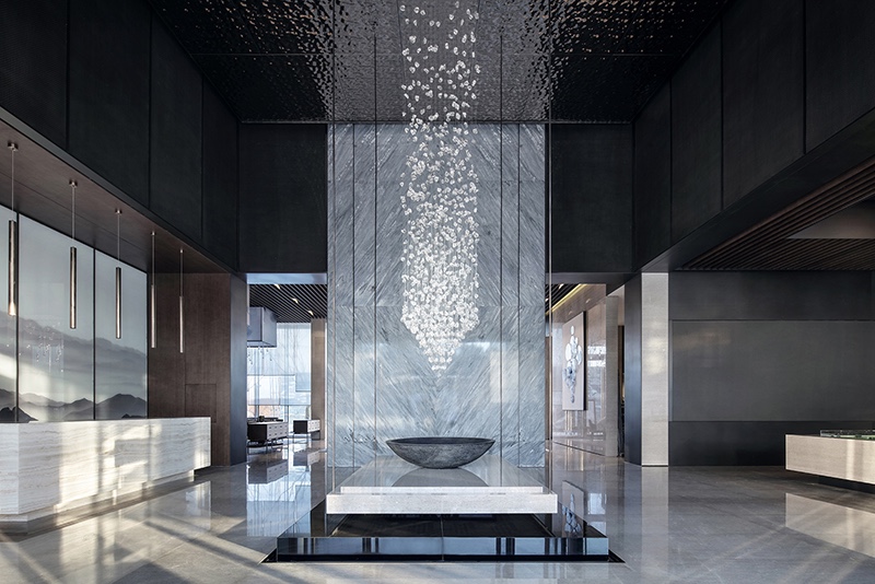 大堂内高7.4米、宽4.5米极富肌理的石材背景墙直插云霄,剔透的水晶装置以“大珠小珠落玉盘”的姿态倾泻而下,视觉焦点恰好落于对纹手法处理的背景墙中心。设计中也注重对挑空两侧的高低划分,强化空间的层次对比,而线性序列又让视觉自然过渡与统一。