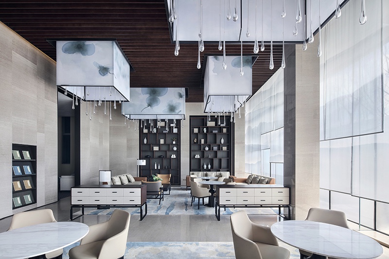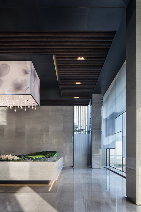 洽谈区顶端延续沙盘区的手法,水墨晕染吊灯以体块穿插于木格栅,其纹路似花瓣散落,又若云雾缭绕,而正要坠下的水滴状进一步提升其空灵意境。开敞式布局在收放自如中平衡着空间的取舍之道,色泽、形态、体量和谐融入整体空间,阳光透过帘幔映入其中,从立面到顶面,诗意的格调跃然而出。