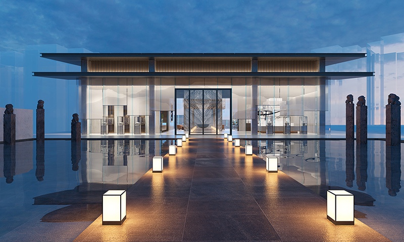 步入庭院开敞有序,在对称的布局、烟波浩渺的朦胧意境中,开启更具仪式感的体验,既强调人、自然与建筑的对话共生,也传达出飘逸的东方哲思。群山轮廓隐约映射于全景玻璃幕墙之上,纵然隔着帘幔,隐约间可一窥室内格局。