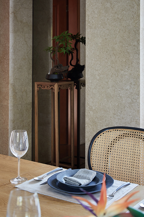 餐厅彻底抛掉原有的繁琐与复杂,注入更多现代轻松属性。藤编的餐椅延续客厅的柔和感,素色的窗帘则是光线的导引,微风乍起时,自然与空间的对话绘就另一幅恬静的画面。