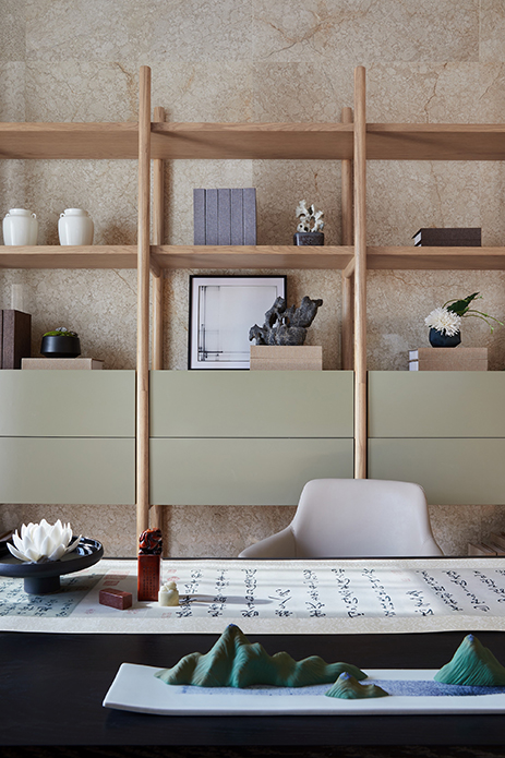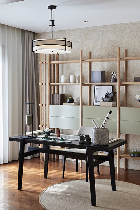 书房舍弃原有的屏风,换以收纳及展示功用兼具的立柜书架,桌面上的物件折射出对书画印章、赏石雕刻的情趣消遣。这里既满足了多功能属性的追求,又打破先前的沉闷,极具文雅之气。