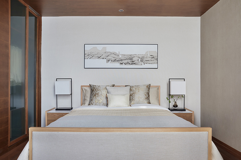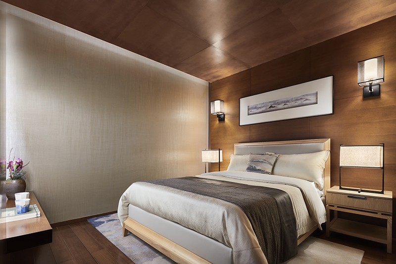 客房沿袭中式对称之风,大方得体,在灯光渲染下,素雅又别具温情,彰显出沉稳雅致的待客之道。