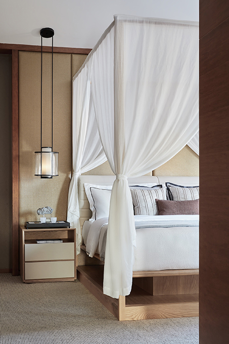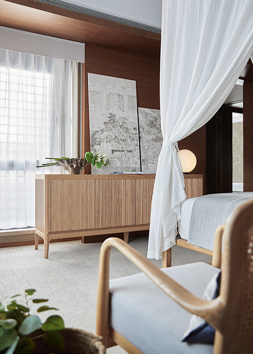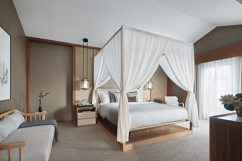 二楼主卧充分利用采光,参照酒店式起居场景,“人”字型屋顶配上架子床,空间感更强,也进一步映射出东方气息以及度假风情。