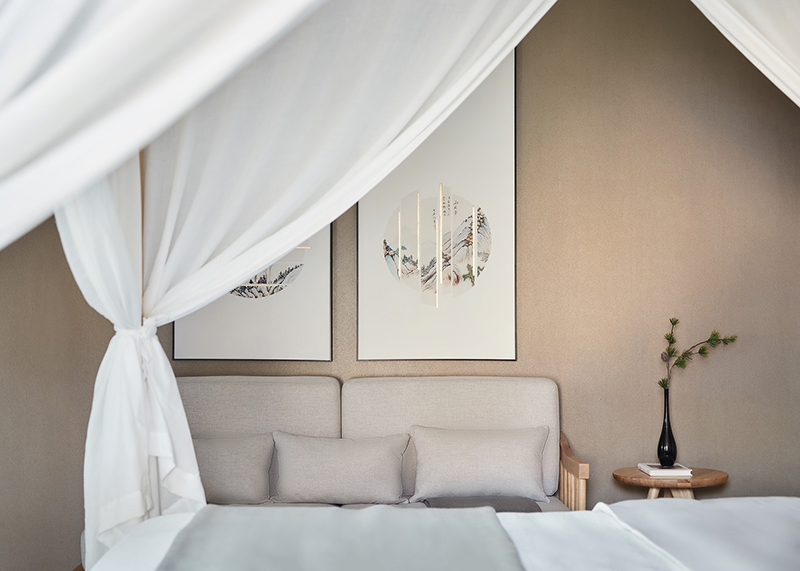 白色纱幔随风飘然而起,随画作与插花对话古今,在看似无意间氤氲着从容自如的淡雅之韵。枕水而息,坐拥太湖风光又将人文意境带入其中,返璞归真的境地莫过如此。