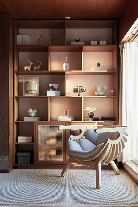 方磊:我们尝试了一些在以往其他项目中相对运用较少的设计手法,严控家居整体的风格搭配、造型款式的把握、以及装饰性氛围的拿捏,同时统筹视觉陈列,还要进行适度混搭等,在经历多次考量与调整之后,完成对它们的整合,这个过程是有难度的。当然,这也是设计师工作范畴中所要面临并予以解决的。