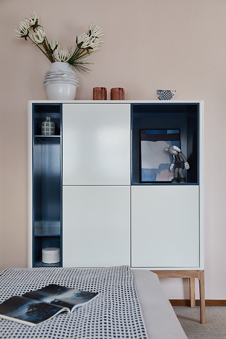 卧室同样蔓延着清新的气息,以素色的壁纸取代床背的大面镜子,剔除繁复的装饰,用淡雅的蓝与生机的绿作点缀,平和静谧与活泼趣味共存,亦是对孩童心性的陶冶。