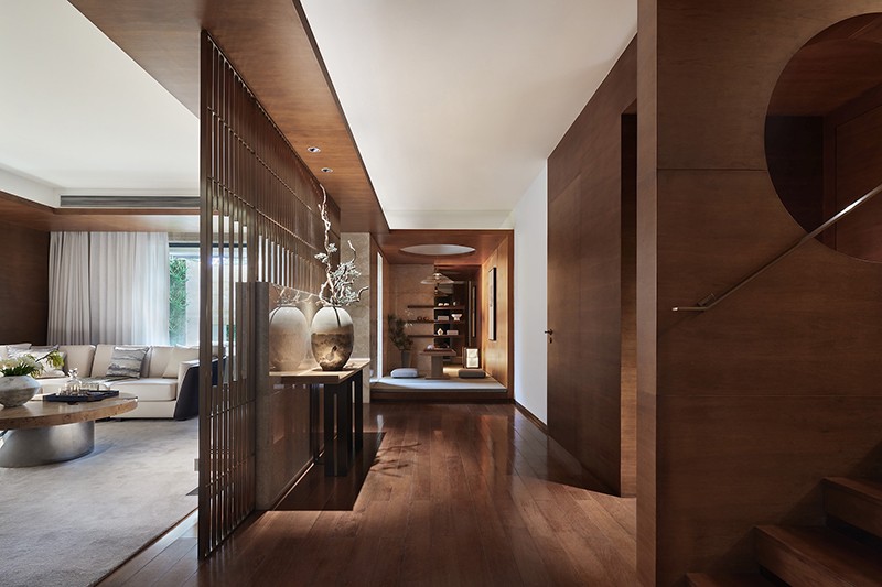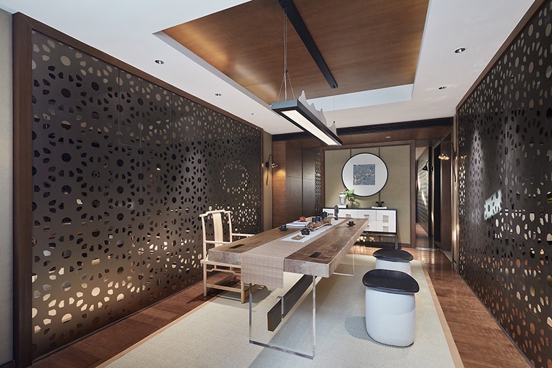 修禅静坐、亦或执子对弈,应景的融合“天圆地方”理念,这是古老东方的哲思,又不会与当代审美产生背离。在平台之上铺设榻榻米,以温润、安谧塑造这一隅形神兼具、物我合一的归属秘境。