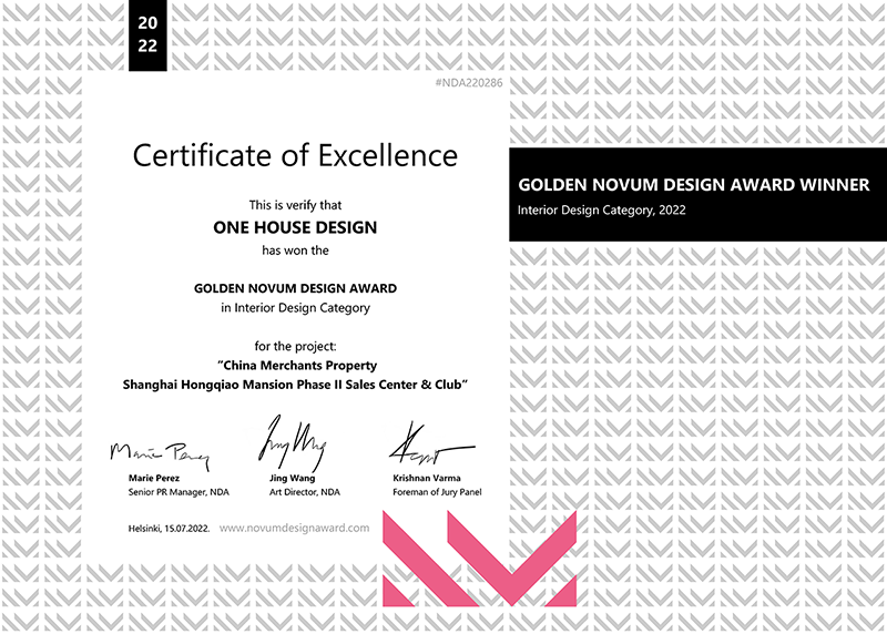 近日,2022法国NDA设计大赛获奖名单震撼揭晓,经过多轮角逐,壹舍设计作品包括上海招商虹桥公馆二期、盐城招商雍华府、壹舍设计新办公室、余姚中南春风江南院样板间夺得头筹,一举斩获四项金奖。01 GOLDEN WINNER 上海招商虹桥公馆二期