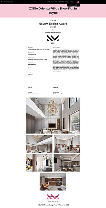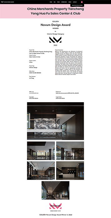 Novum Design Award(简称NDA)是国际上首屈一指的先锋设计奖。作为高品质设计的证明,始终致力于为多领域的优秀设计师带来国际声誉和认可。比赛面向全球范围内所有建筑、室内、城市规划与景观、家具、照明、数码艺术与平面、包装、产品、时装与纺织、摄影与照片处理相关的设计从业者开放。