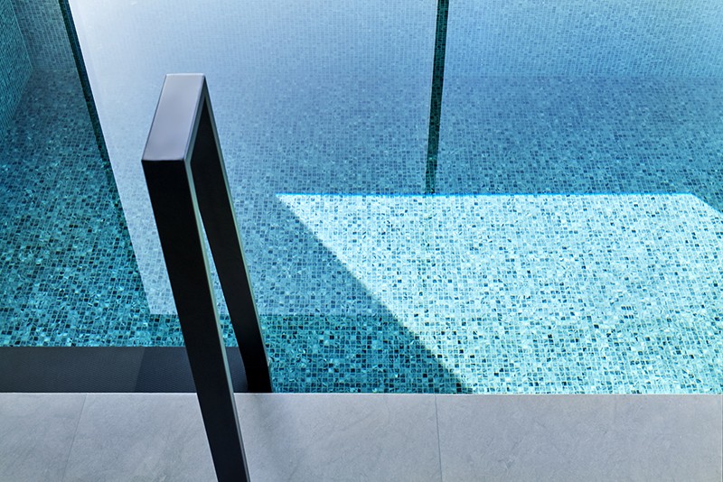 泳池随阳台顺延而出,恰如精致的璞玉,深灰色马赛克的独特纹理,静谧的倒影,让宁静和清凉沁人心脾。碧绿的蓝天连接着透亮的水波,私家独享畅游其中,无比自由惬意。