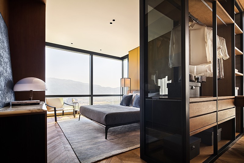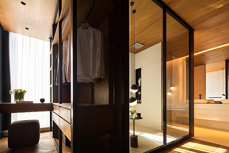 在某一瞬间邂逅不期而遇的惊喜,无疑是生活情趣的注入。“我们充分考量步入主卧套间的第一感受,以前方的窗景和明亮简洁的浴室相迎。同时利用大块镜面去反射、渗透,为其扩容,既保证各功能区的顺畅流转,又可让淡然的气韵自由穿梭,可谓每一个角落都令人身心愉悦。”方磊介绍道。严先生夫妇对此也分外满意。