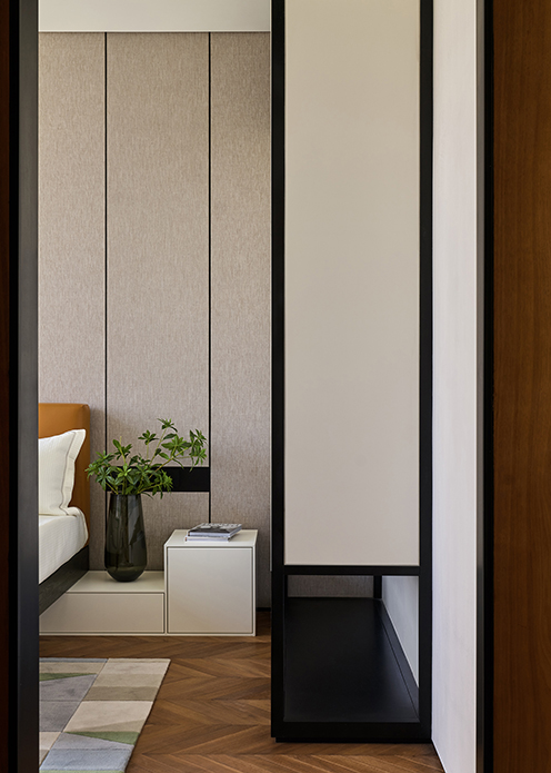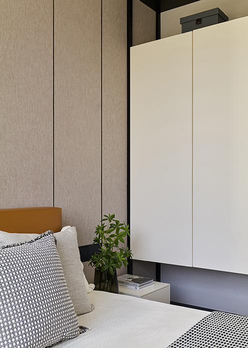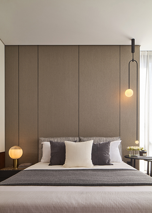 室内对造型、尺度的把控,同样关乎居住感受。客卧床头柜采用高低式布局,柜体舍弃一体顺延至顶的形式,渲染轻盈的呼吸感,不经意间释放出宁静、慵懒的包容气息。
