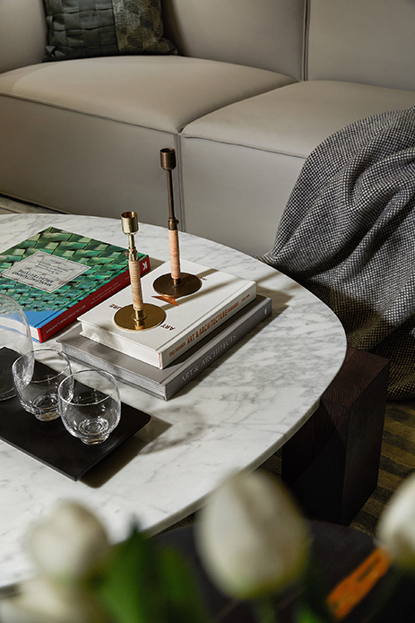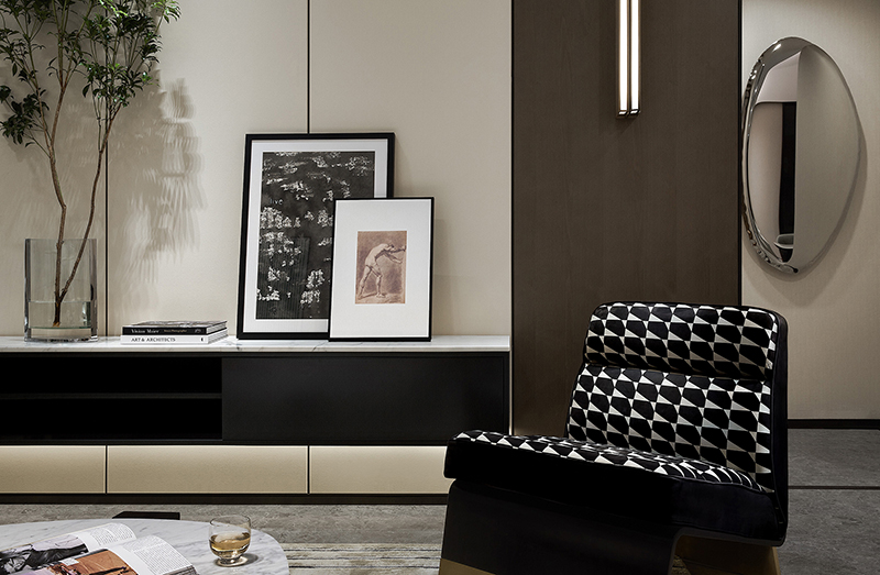 尺度阔绰从容,动线优雅流畅,惬意之感自客厅扑面而来。电视背景墙以木饰面和皮革做拼接,层次感十足,软装陈设亦强调功用,拒绝过多装饰,加以色彩、肌理的呼应,干练利落,也呈现出理性的轻奢调性和高雅的审美体验。