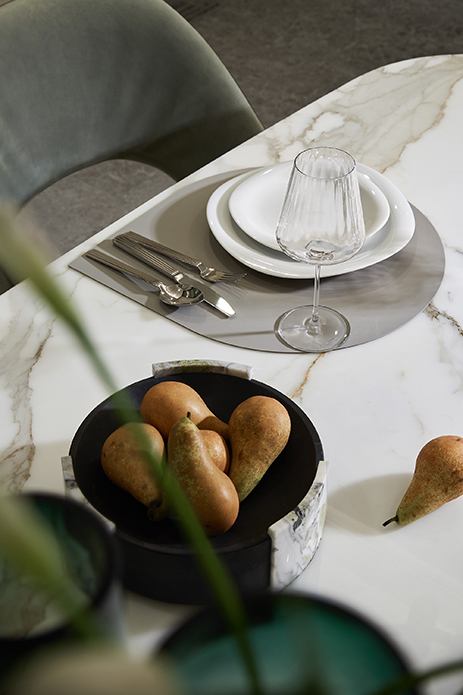 共聚一堂,共品一汤,也是一派温馨之景。餐厅从淡雅的绿着手,圆弧的造型中和硬朗,配合协调的比例尺寸,释放场域。又以古铜灯具做点缀,在暖光的映照下,尽显轻盈之态。
