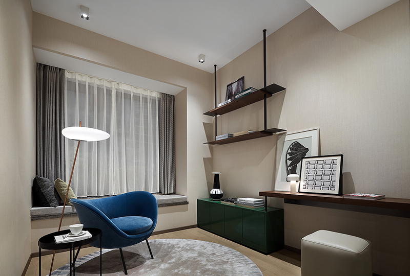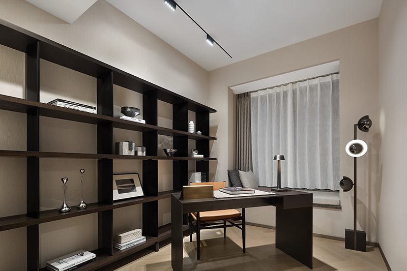 注重物质的同时也需要对精神加以滋养。书房可独处冥想,可伏案而作,材质沉稳大气,间或加入跳色破解沉闷,陈列饰品承载志趣,将思辨、人文、轻松蔓延其中,渲染着独特的思想疆界。
