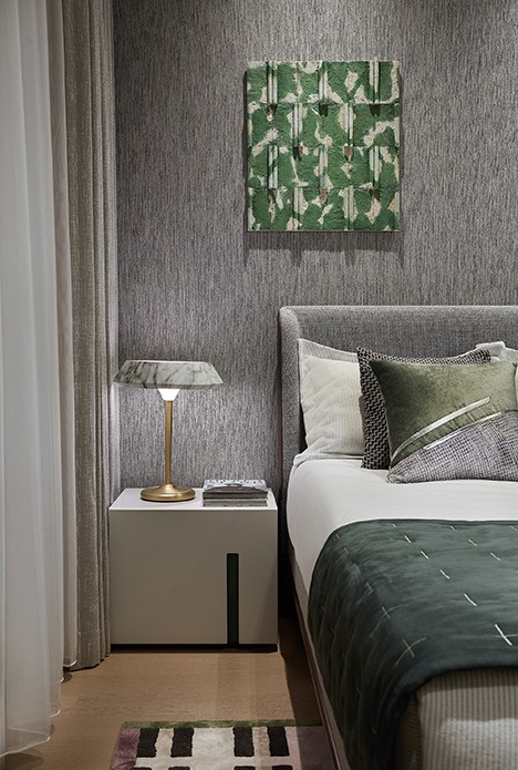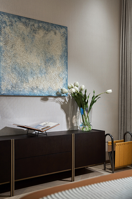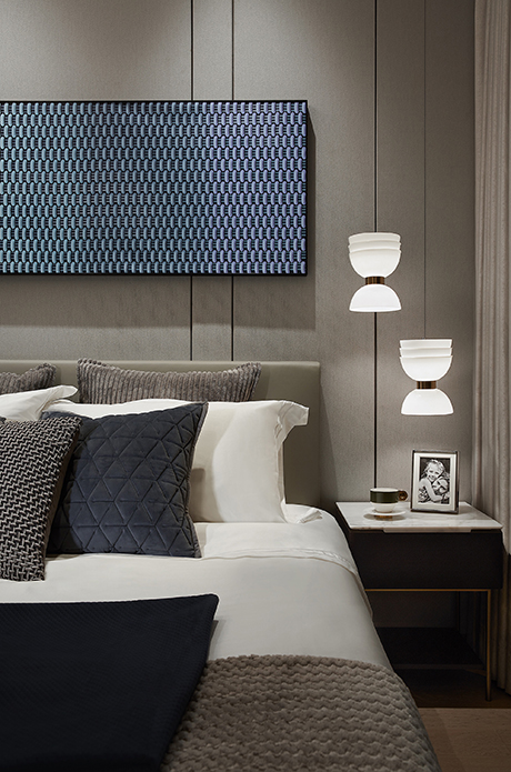 主卧套间同样从自然界汲取灵感,糅合色彩、光影、纹理元素,这既有着对客餐厅一脉相承的延续,又基于睡眠区的实际考量加以变通,不乏宁静安逸之感。人文关怀从不缺席,圆与方,硬与柔,渐变转换,虚实交杂,在视觉与触觉的双重感官下,孕育着丰满的层次。