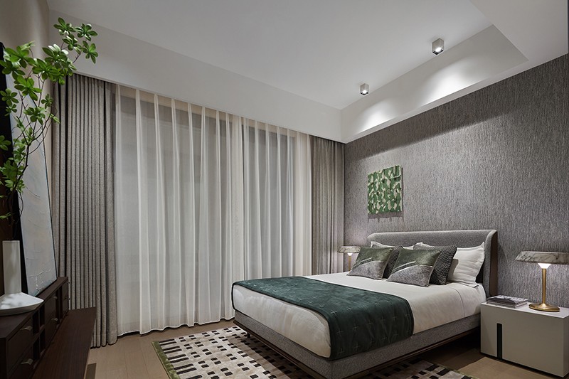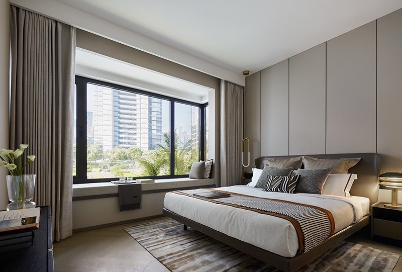 次卧汲取度假酒店小家化理念,进一步挖掘舒适度与呵护感,床尾凳、一体式书桌柜体的引入,满足丰富的居住形态,以合理的构造,给予居者高品味享受。