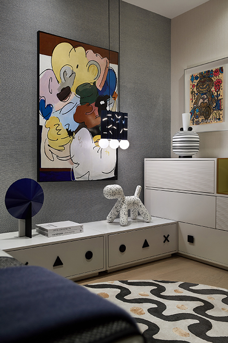抽象的感知中凝聚着艺术的力量,儿童房色调舒缓,轻柔交织,画作亦不落俗套,将活力渗透到每个角落,共同营造了多元共生的文化和成长体验。