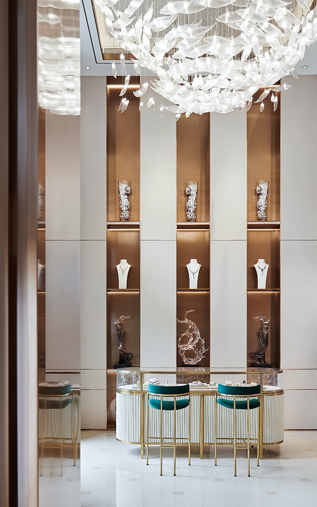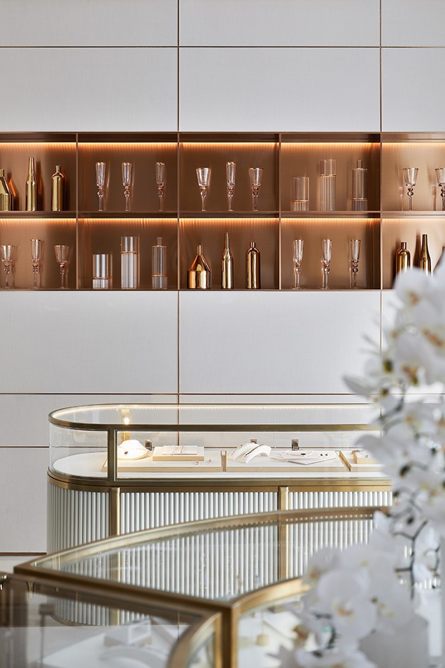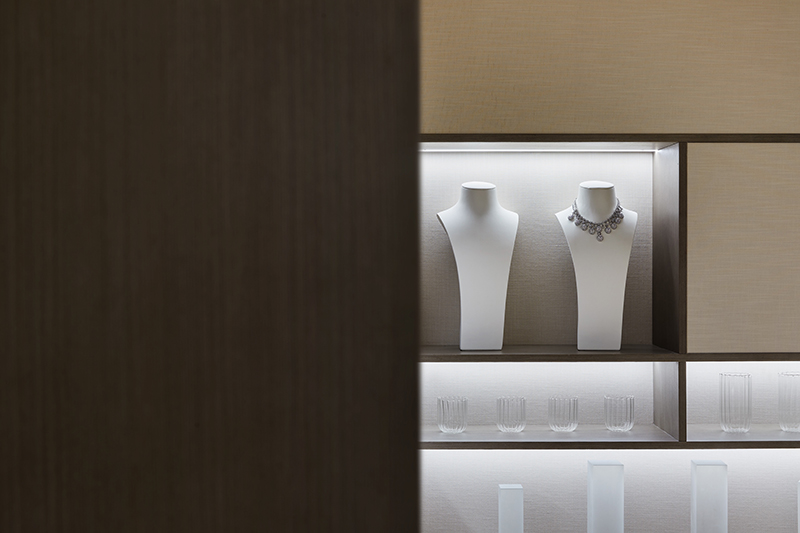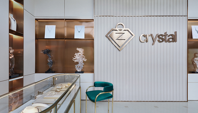 壁布一路向右侧延伸,垭口上方覆以夹丝玻璃所构筑成的立面,与墙体良好互衬,一种别样的高级灰质感扑面而来。同时采用各式橱窗、展示柜,搭配水晶衍生品进行陈列,材料、肌理与色泽于此交织对照,达成丰富意义的消费体验,为空间赋予更多的商业价值。