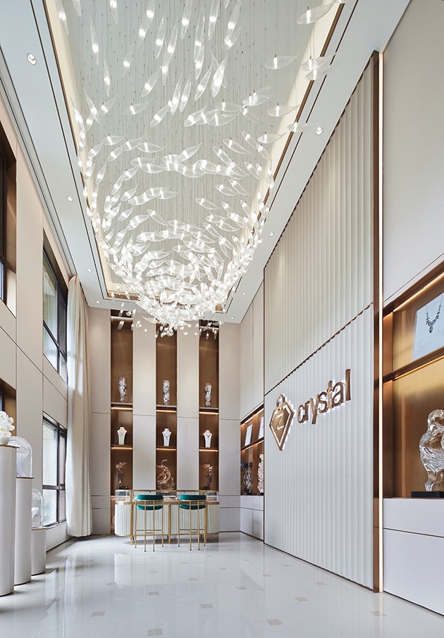 入户以高挑空营造恢宏气势,墙面采用素色壁布铺就,内嵌金属分割条,并以内凹的造型手法设置大面积展示区。结合品牌墙及顶面吊灯,无处不彰显着水晶的主角地位,为访客带来全方位的立体观感。