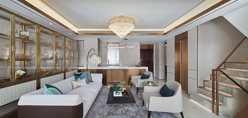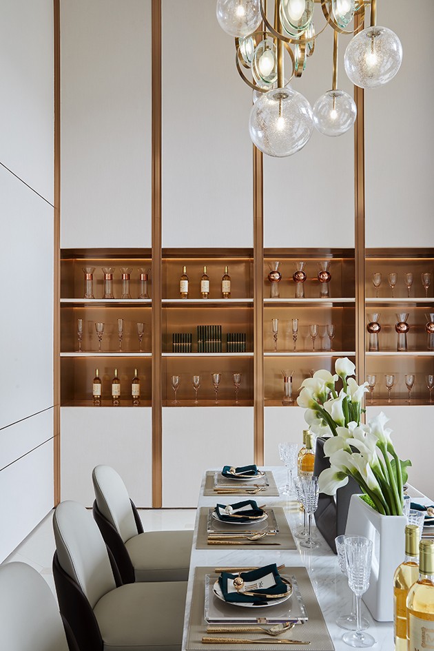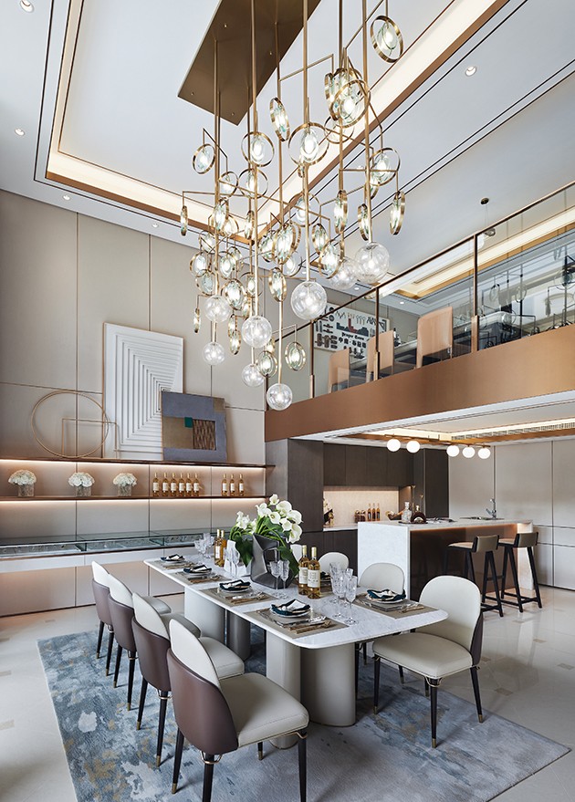 餐厅处的挑空极具广阔的视觉效果,纵横两端的延展给予空间丰富层次,墙面的展陈区则带来几分新潮与艺术美,低调奢华之感呼之欲出。