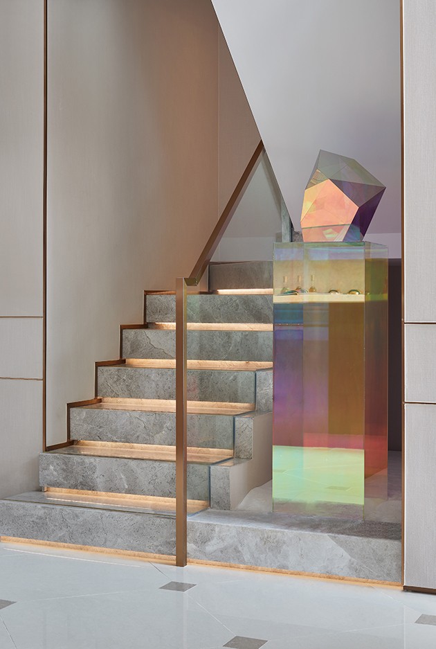 移步向下,B1层楼梯口设立水晶钻石造型的陈列品,彰显其非凡的地位。