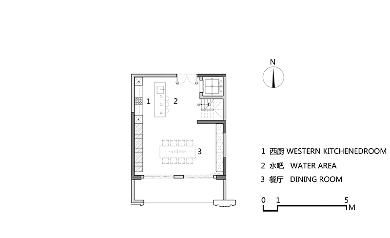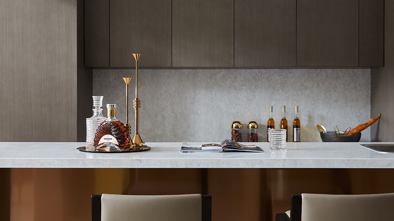 水吧台、西厨、餐厅随即映入眼帘,三者巧妙联合又各有特色。木饰面、大理石及金属的有效配比,在光线映衬下,传达出一种年轻化且富有时尚感的轻奢气质。