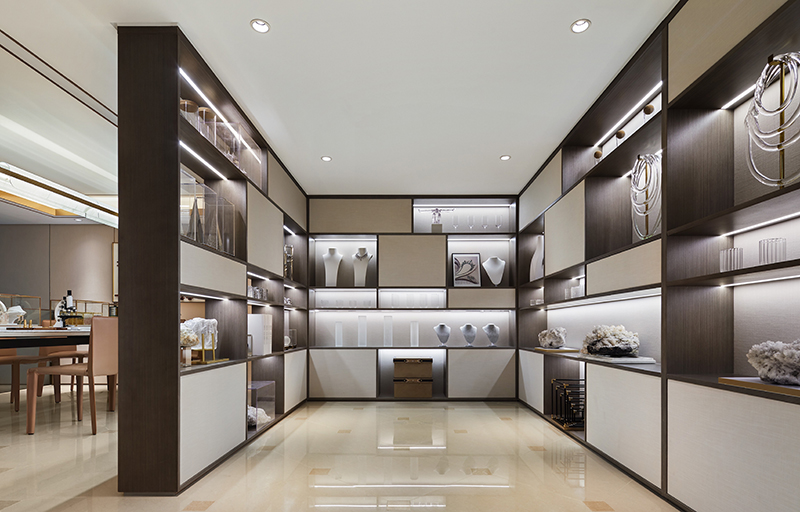 背后的珍品展示区则由大小各异、高低错落的格架组成,配以灯带点缀,以穿插、通透实现区域间的互动关系,打破了常规的沉闷,极具美感与趣味性。