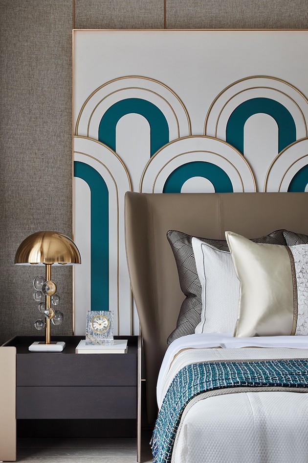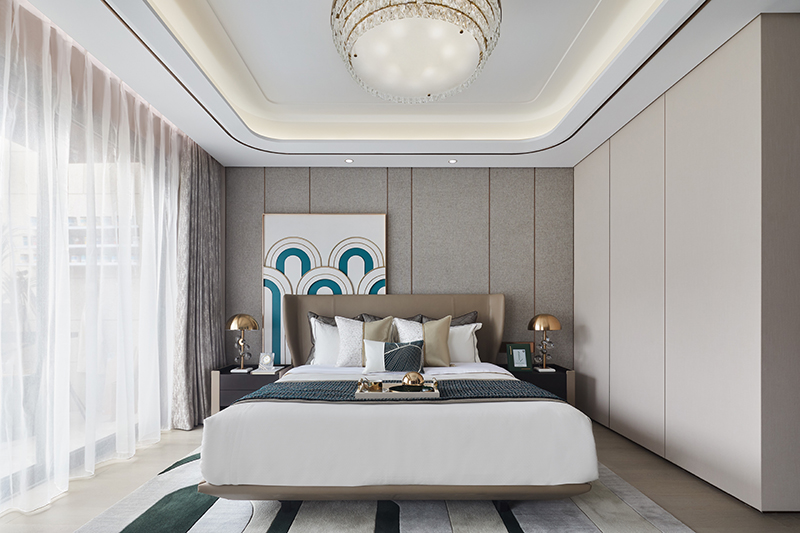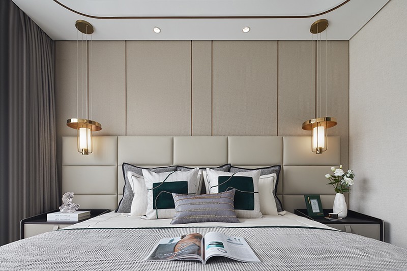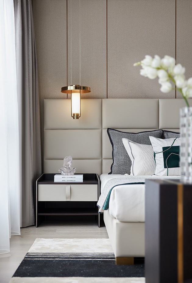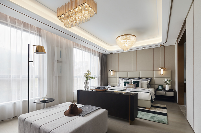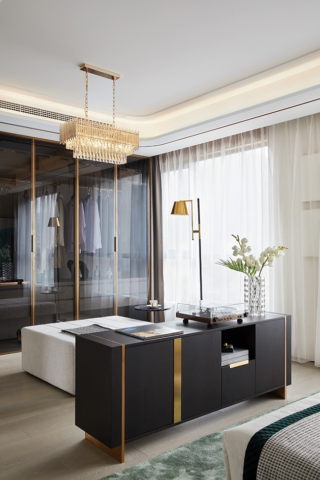 主卧套间在开放的格局中,流畅地诠释出起伏的美感,各功能分区在交错延伸中创造出丰富而统一的设计语言,尽显精致优雅的样貌。