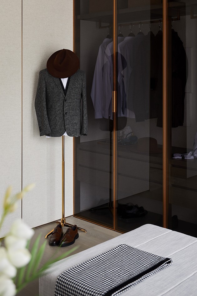 在阳光映射下,沿用金属与玻璃材质的衣帽间,释放出干练型格与微妙张力。既凸显其本身的光泽与韵味,又保证了与套间的温暖联结。