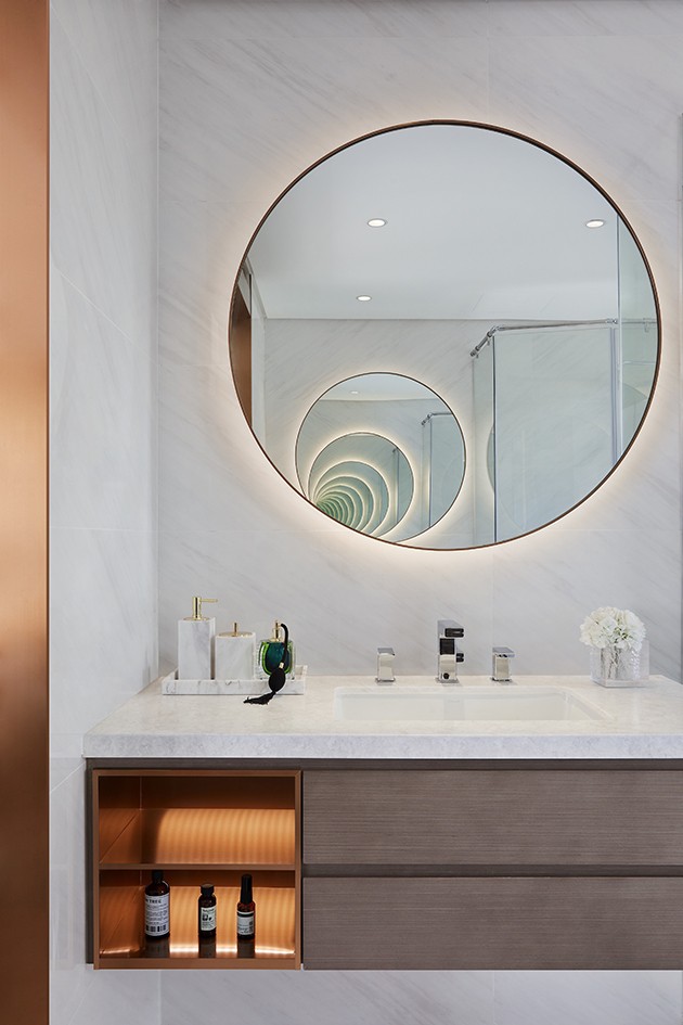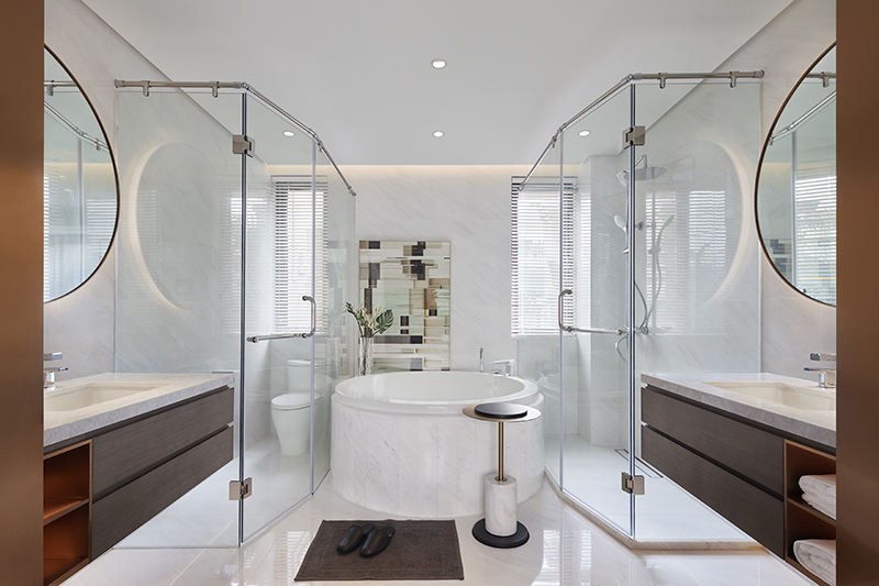 主卫遵循对称手法,矩形体块与圆弧形态有机搭配,其背后则是依据人在场景中的功用及感受来排布。加上对细节、造型、灯光的谨慎把握,共同演绎大气格调。