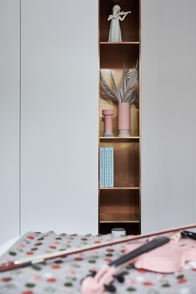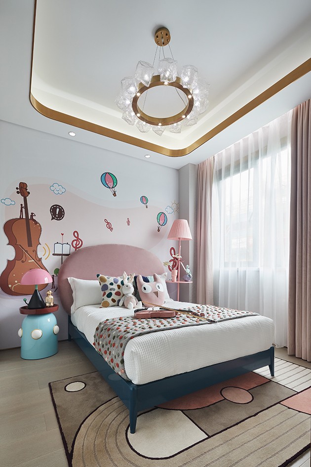 适度的粉嫩昭示小公主的私人领地,以马卡龙色配合低饱和度的色彩进行叠加组合,辅以音乐元素妆点,一种欢快、活泼、灵动与童趣充盈其间。