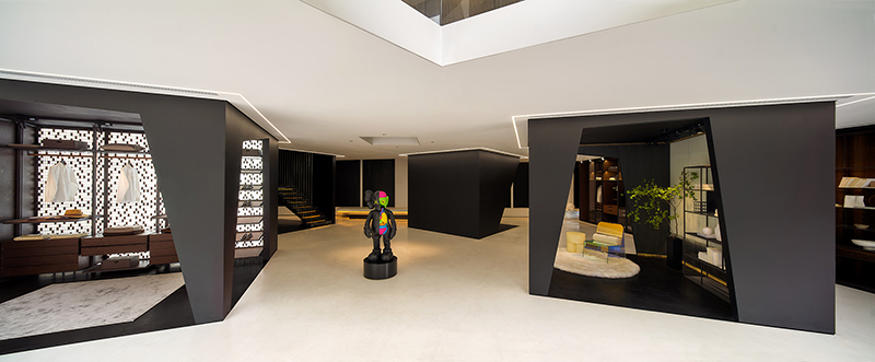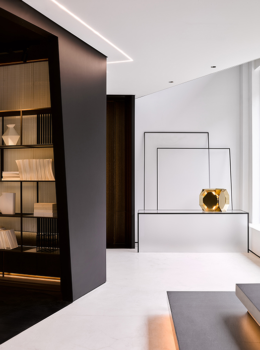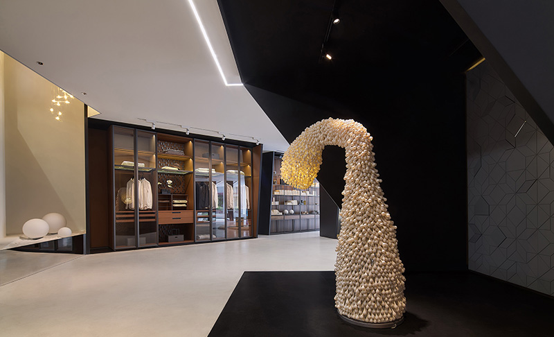 OOMOO之家上海旗舰展厅宛如一个容器,家具、陈设、装置、艺术品等诸多元素在其中逐层渗透,显得流畅、灵动且充满张力。以宜人的尺度建构开放式生活,打破界限,赋予自在洒脱的感官享受,传达出OOMOO极致、张扬、独一、潮流的调性。同时在产品与空间“你中有我、我中有你”的紧密关联中,也透露着壹舍对于当代人居美学的极致思考。