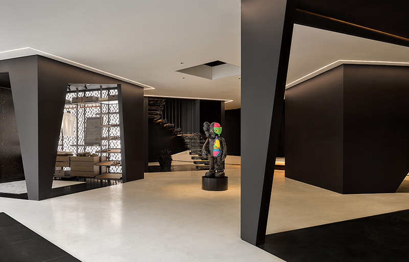 设计师将建筑手法迁移至室内,以大块黑白布色,硬朗的线条穿插其中,简洁的白底与黑色体块串联,不设置庞杂的隔断。干净利落的半私密式布局,既保持了亲密,也留有神秘,在递进与交互之间演绎出层次之美。限量解剖版的KAWS玩偶在正中央处热情迎接每一位访客的到来。