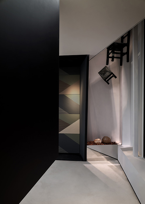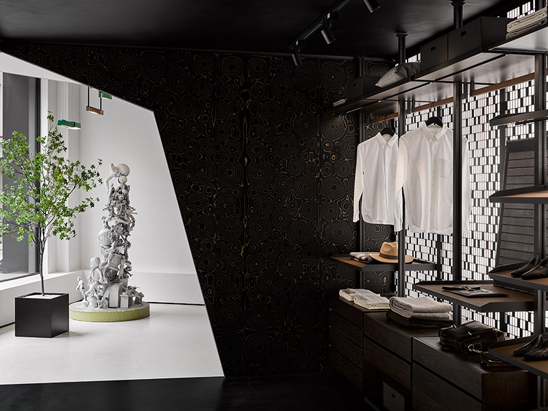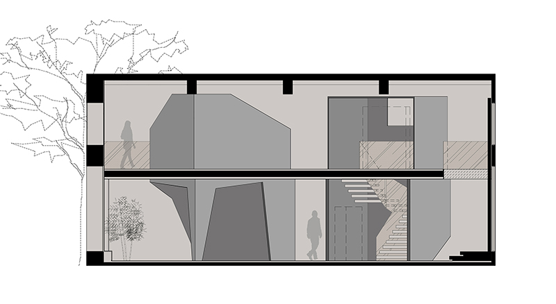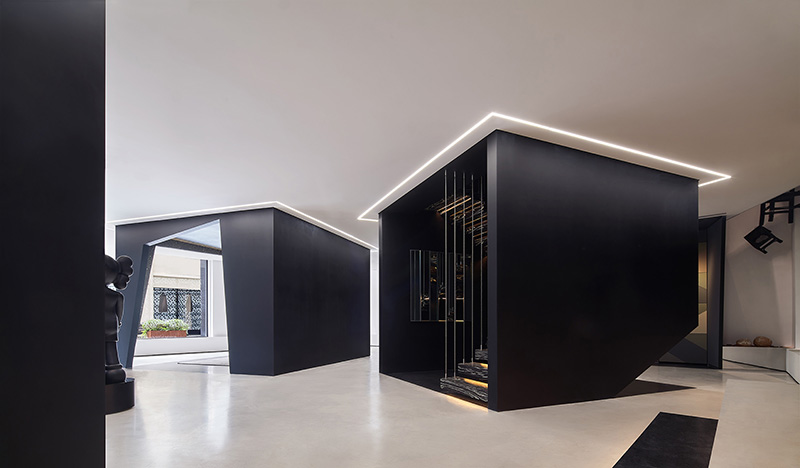 “一二层楼之间的纵向延伸同样是重点,楼板并未完全封闭,而是以散布着随性的洞口形式让上下贯穿、互动,这和黑盒子上不规则的切角做法及目的异曲同工。此外,每个角落留有的挑空区域,也各自匹配了不同的造景点缀。”方磊讲到。