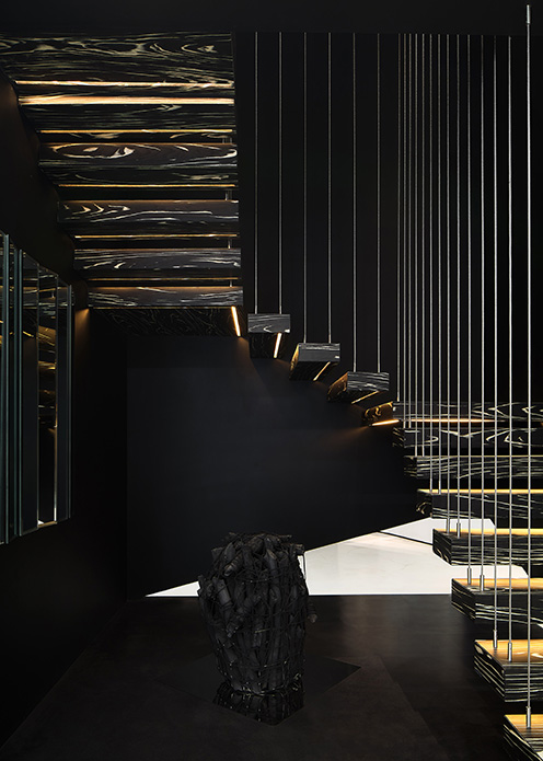 悬挑楼梯以被包裹的姿态蔓延而上。虚实相生的光影、连续的界面传递至臻深邃的魅力,停驻的前后视觉落点也都通过精心考量。