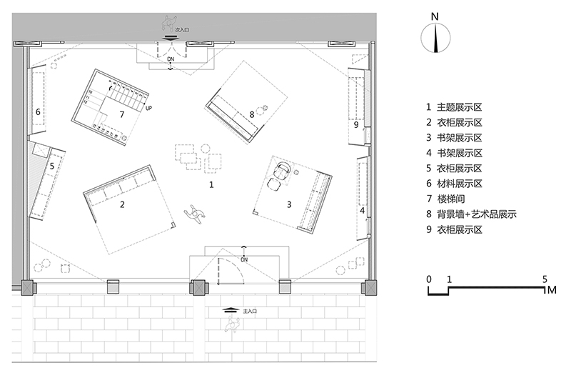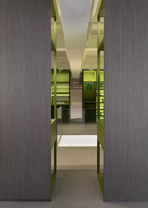 跟随楼梯而上的还有盒子概念,环绕式的组合衣帽柜有别于楼下的冷静硬朗,瞩目的绿色瞬间唤醒活跃与生机,进一步彰显着OOMOO的无限可能与多样选择。