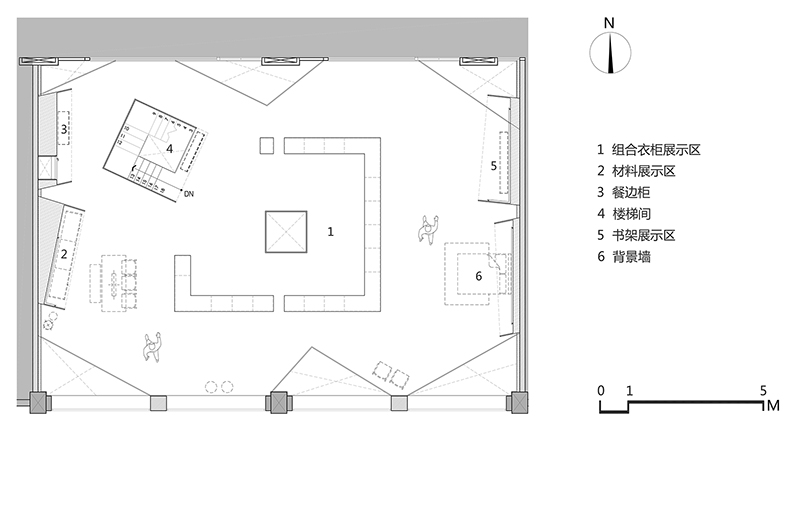 偌大的玻璃窗为展厅引入充沛的光线,室内借由体块以及色度上的调和,清爽简练。切角开合之道的拿捏思考,贯彻至四周全方位,并打破方正的常规逻辑,又从动态上将彼此连接,表现得疏密有序、收放自如,既有适度凸显,又不会与整体割裂。