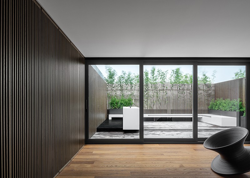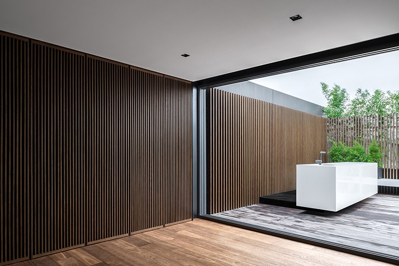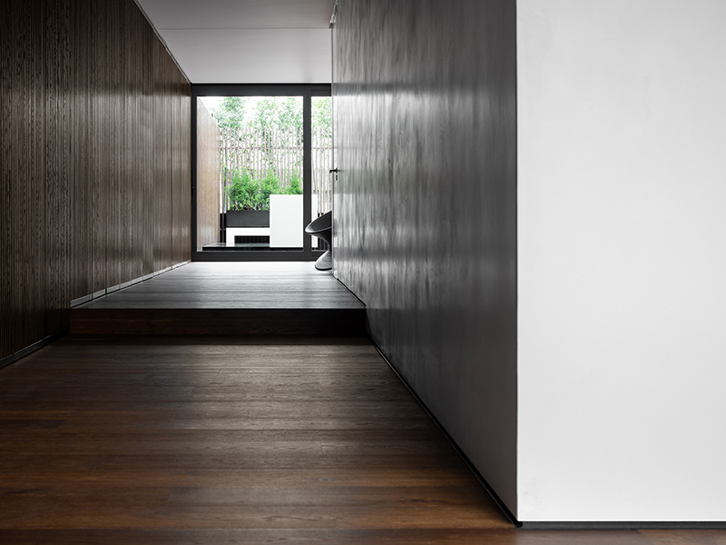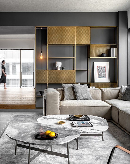 廊道的设计同样拒绝繁复,大片格栅一体延伸极具视觉冲击,背后还预留了大量的收纳区,表象所见之外更具功用内核。