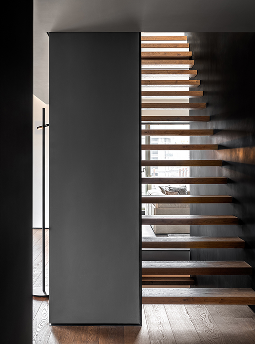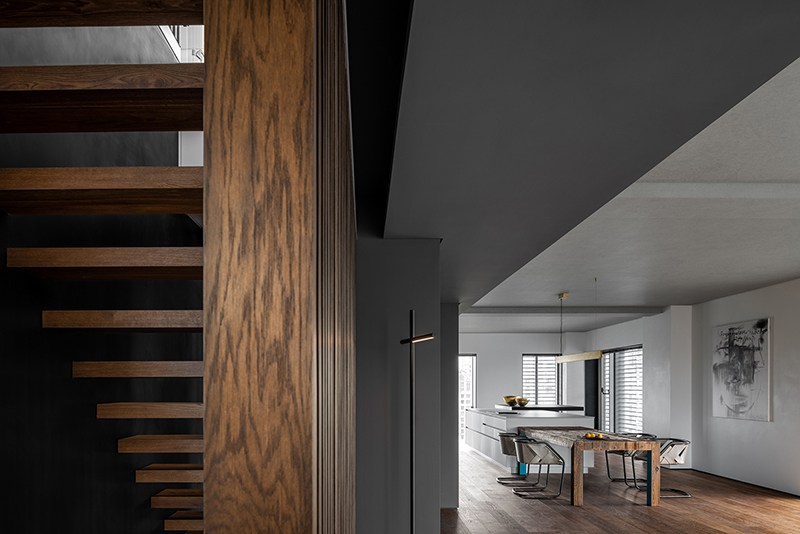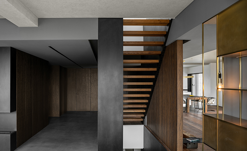 楼梯的位置经过设计师多次反复调整,基于整体布局,以及对横向、垂直枢纽便捷性的把握,最终确立其所在。木质踏步的镂空排列,呈现轻盈的悬浮感,又顺畅的将光照引入,材质的应用在冷暖调和中也显得刚柔相济。
