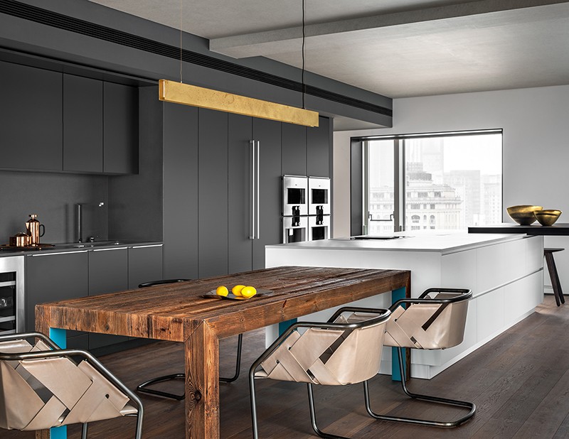 餐桌与岛台一体顺延,呈叠级状起伏,与西厨区的开放互联也遵循着豪宅应有的比例尺度。三面落地窗让这里拥揽绝佳的视野与采光,透过形态、材料、色泽与细节,越发诠释出大都会的俊朗风度。这是设计团队对一贯的克制平衡之道的践行,蕴藏着对简约美学的严谨思考,也无一不透露出对品质感的严苛追求。