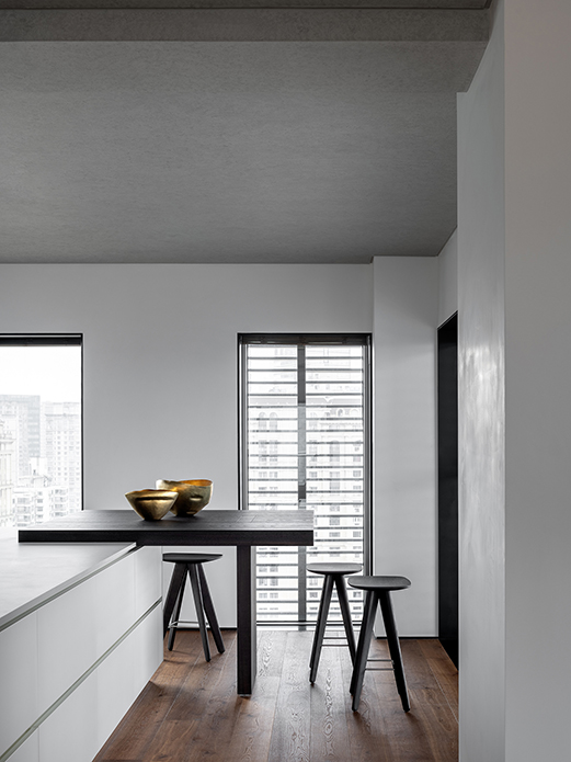 室内与露台联动,建筑与自然相拥。深浅对比的映衬,让吧台宛如悬浮空中,这也为派对提供理想场所。于露台之上可俯瞰核心主城区,对岸陆家嘴天际线仿佛触手可及。都市的繁华与匆忙在此消散,悠闲惬意之感随即而生。