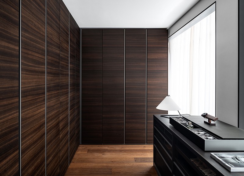 男女主人的衣帽间彼此相邻,又因动线的合理设置保证了使用上的互不干扰。业主品味及工艺本身的魅力皆在细致的划分中悄然流露。密室作为豪宅不可或缺的一项配置,设计师亦心思灵动,将其巧妙融入进来。
