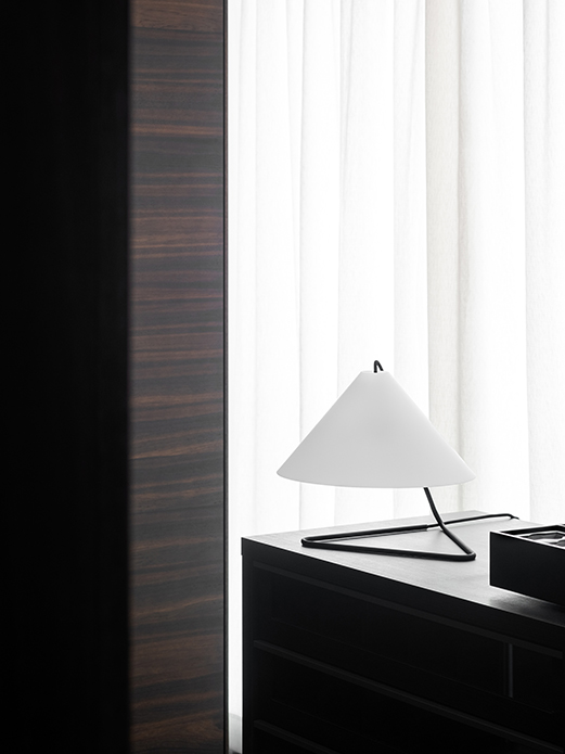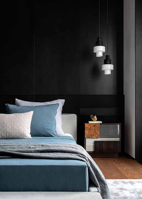 豪宅之所以“豪”,非但在于“大”,丰富的细节亦理应值得考究。主卧在点线面的排布中有着熟稔自如的转换,在黑白灰的围合中饱含深情。床头采用方磊惯用的三角构成手法,既打破对称式单调,又构成了入室的视觉落点。所选取的灯饰本身也渗透着设计师的精巧心思,与卧室浑然相融,增添一抹柔情的点睛之笔。