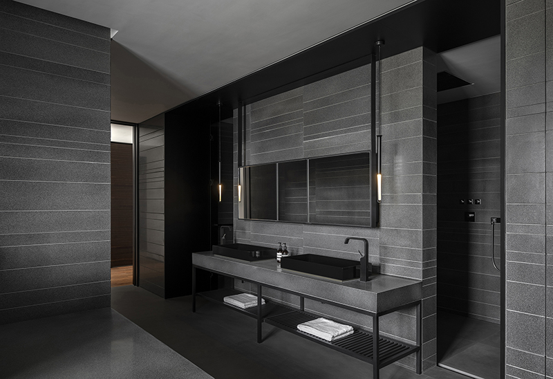 偌大的主卫内,设计师精准推敲比例尺度,充分照顾每一寸的室内感受、构图审美、细节质感等,通过石材清晰的线条、隐约的纹理,笼罩出一种包容之感,暗黑中的优雅,愈发显得意味悠长。